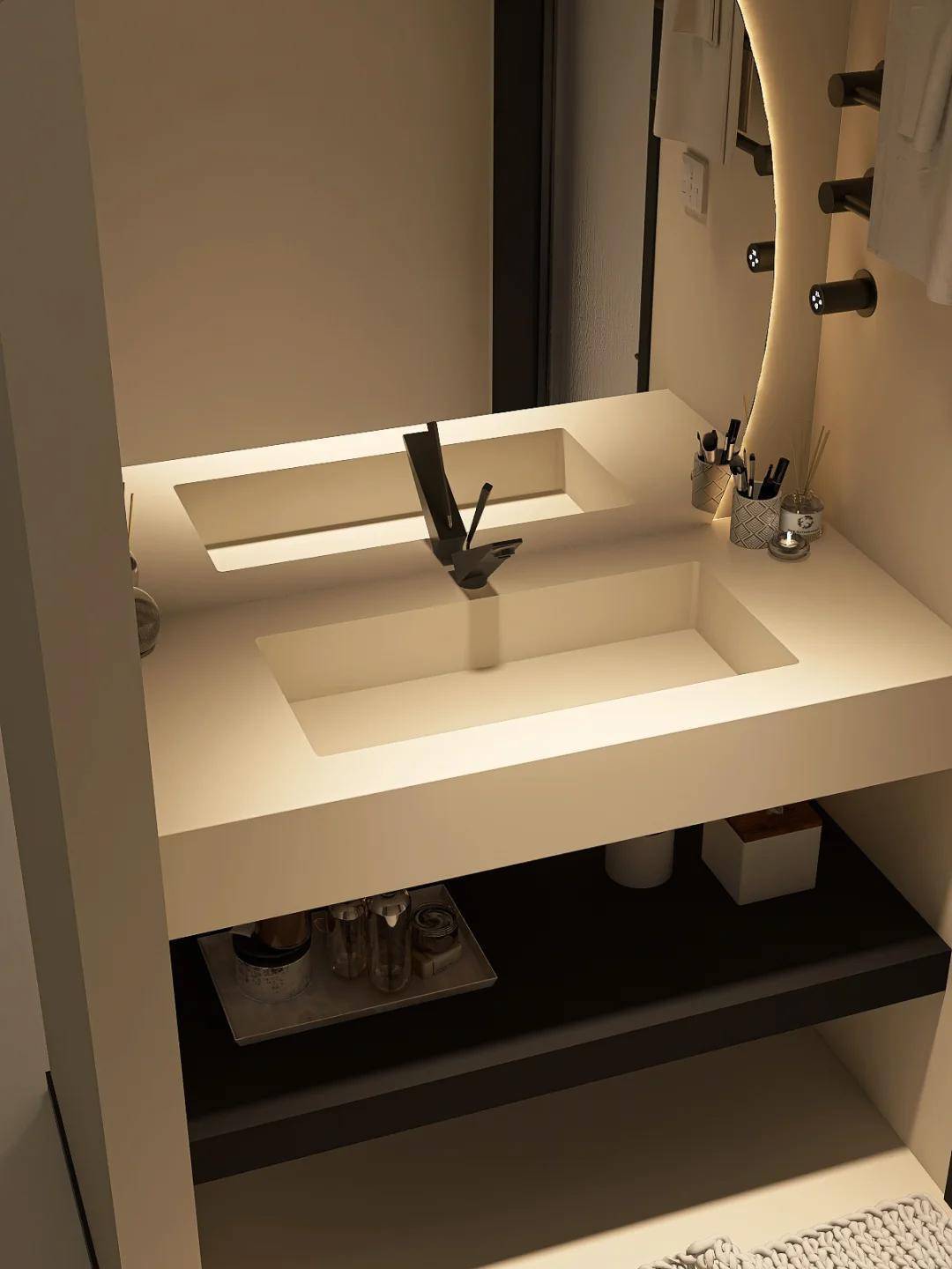 真正的三段式设计绝非简单的 “一分三”,而是遵循 “使用动线 + 功能独立” 的双重逻辑。洗漱区通常设置在入口处,搭配 1.2m 长的洗手台与镜柜,晨间化妆、夜间护肤都能从容操作;马桶区采用隔断门单独封闭,不仅隔绝异味,更能实现 “如厕自由”;淋浴区则通过防滑地砖与下沉式设计,形成独立防水区域。某 89㎡户型案例中,原本 4.8㎡的卫生间通过三段式改造,竟实现了三人同时使用而互不干扰的神奇效果。